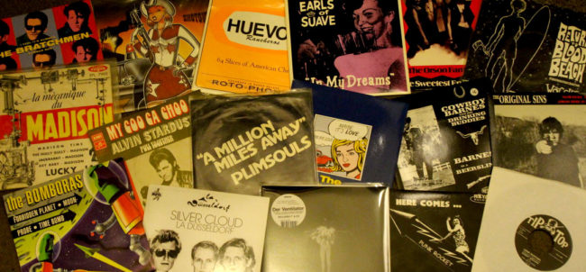 Ouais. Une petite pluie de 45 tours, les amises, pile devant la boutique ! Taulier, qui était de sortie avec son clope, s’est pris ça sur la cafetière et, allez, professionnel, est vite rentré se secouer le râble derrière le Rideau (c’est sa maison dans le fond). Voilà là, une grosse première flaque de chouettes…